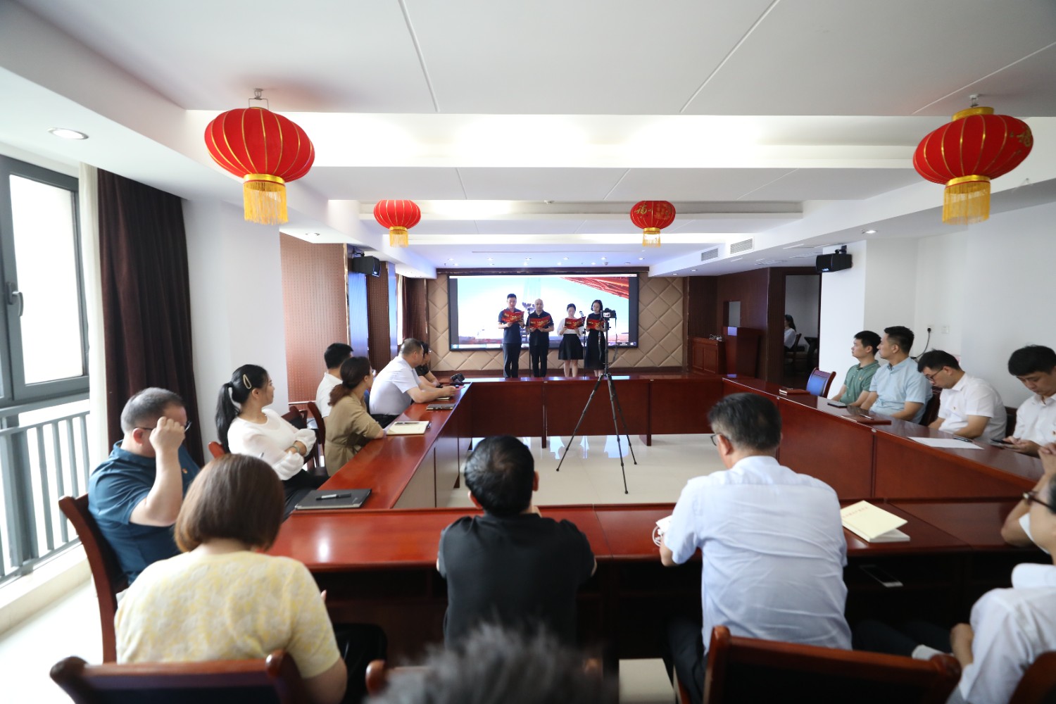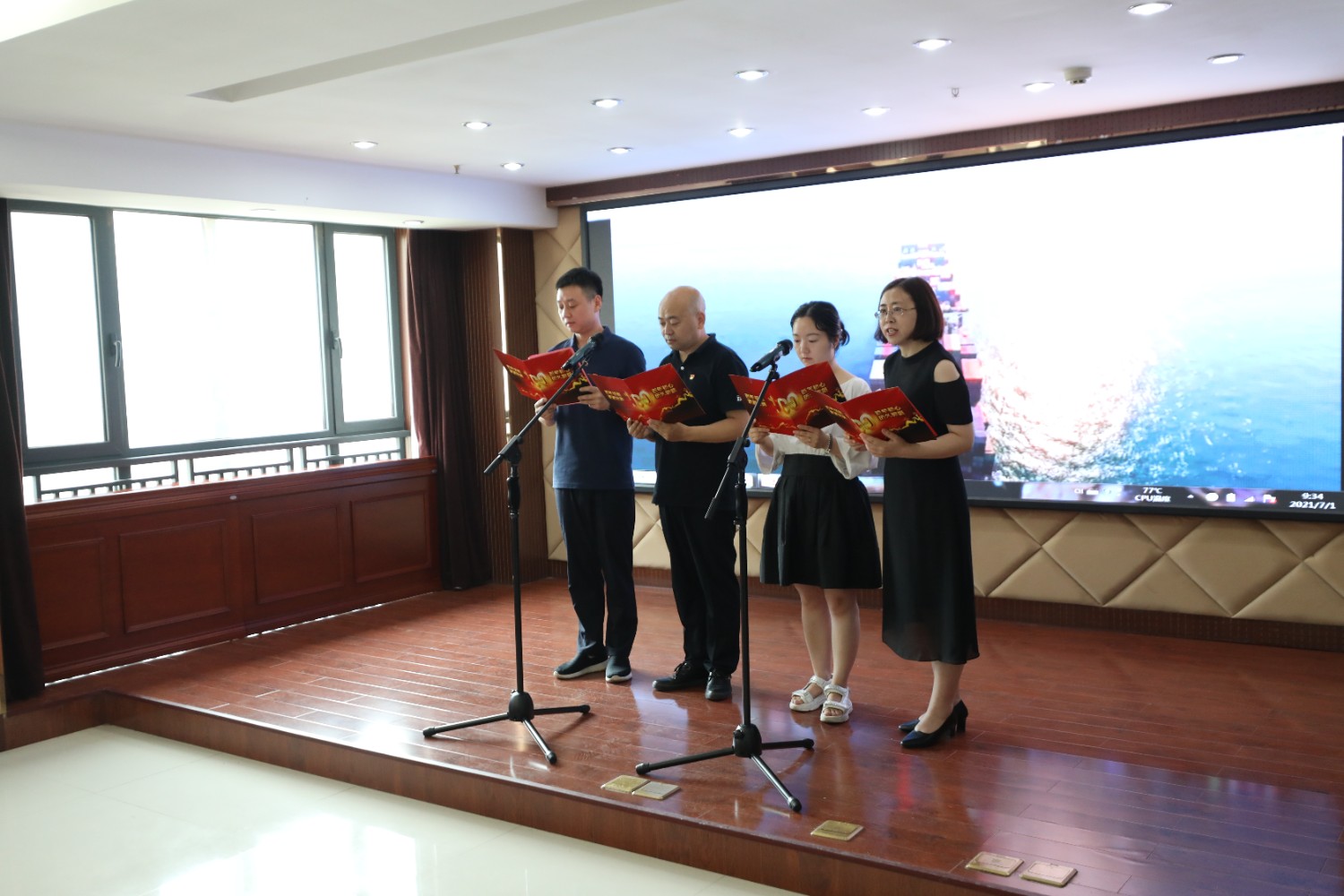 7月1日,在中國共產(chǎn)黨成立100周年的光輝節(jié)日里,高速石化公司機(jī)關(guān)黨員干部群眾在十樓會(huì)議室共同觀看《慶祝中國共產(chǎn)黨成立100周年大會(huì)》電視直播,并舉辦了慶祝建黨100周年“黨旗在心中飄揚(yáng)”主題黨日活動(dòng)。公司領(lǐng)導(dǎo)為7月1日過政治生日的黨員送上了政治生日賀卡和寄語、分享黨史故事;最后,由黨員代表帶來詩朗誦《中國力量》《相約在第一百個(gè)春天里》、與會(huì)黨員共唱紅歌《沒有共產(chǎn)黨就沒有新中國》,把頌歌和祝福送給親愛的黨。