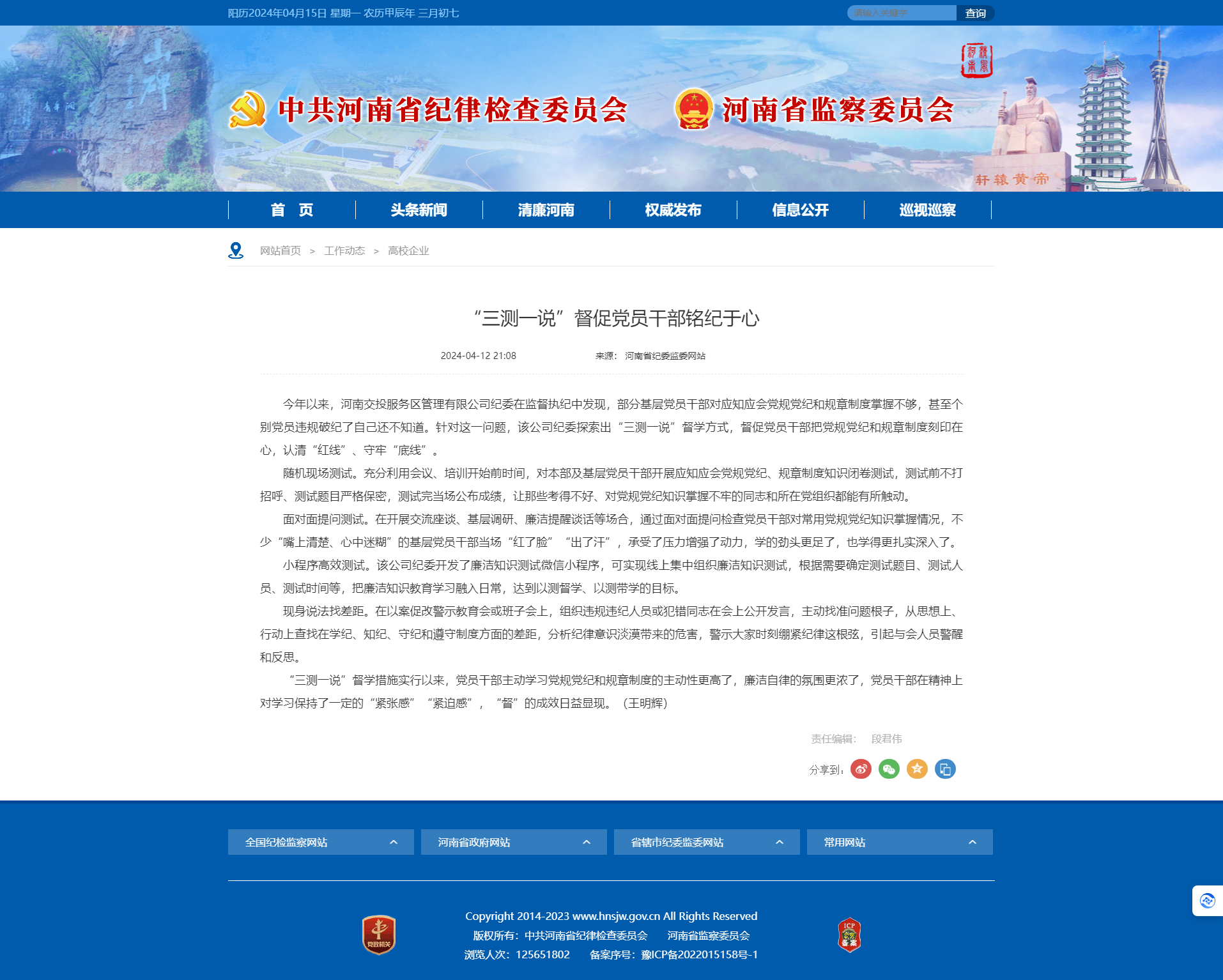 省紀委監委網站刊登公司紀委文章《“三測一說”督促黨員干部銘紀于心》
