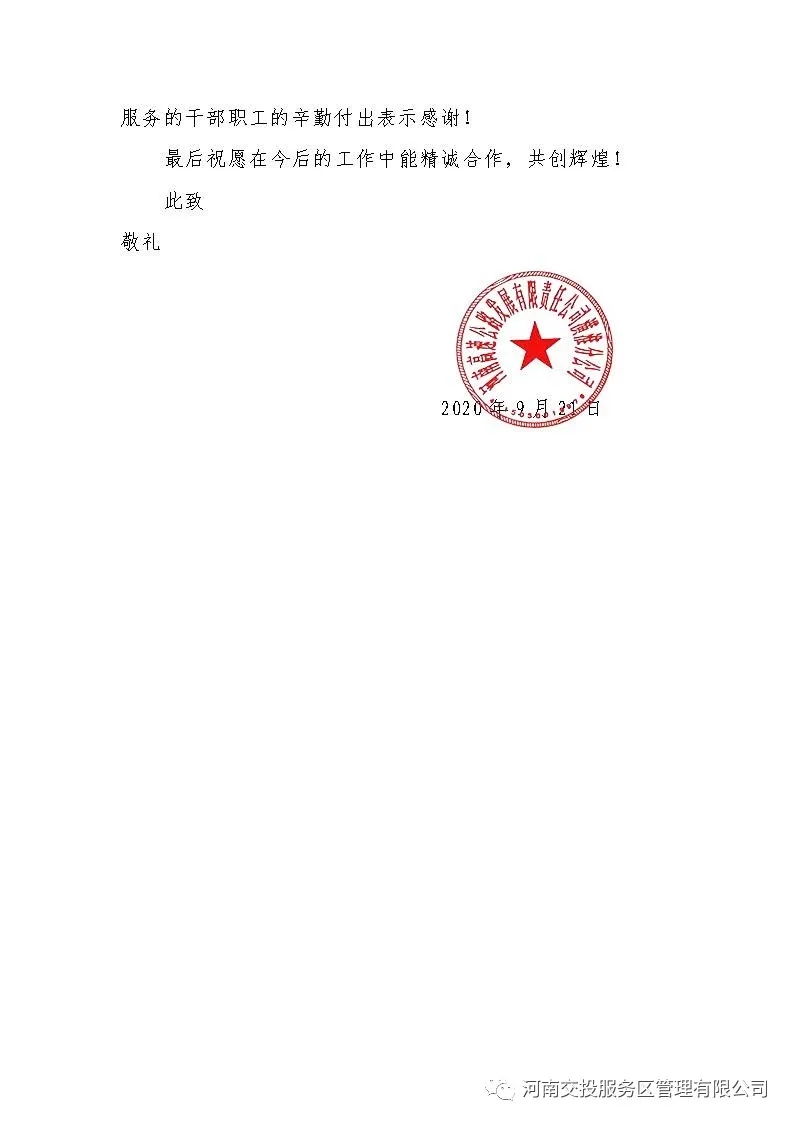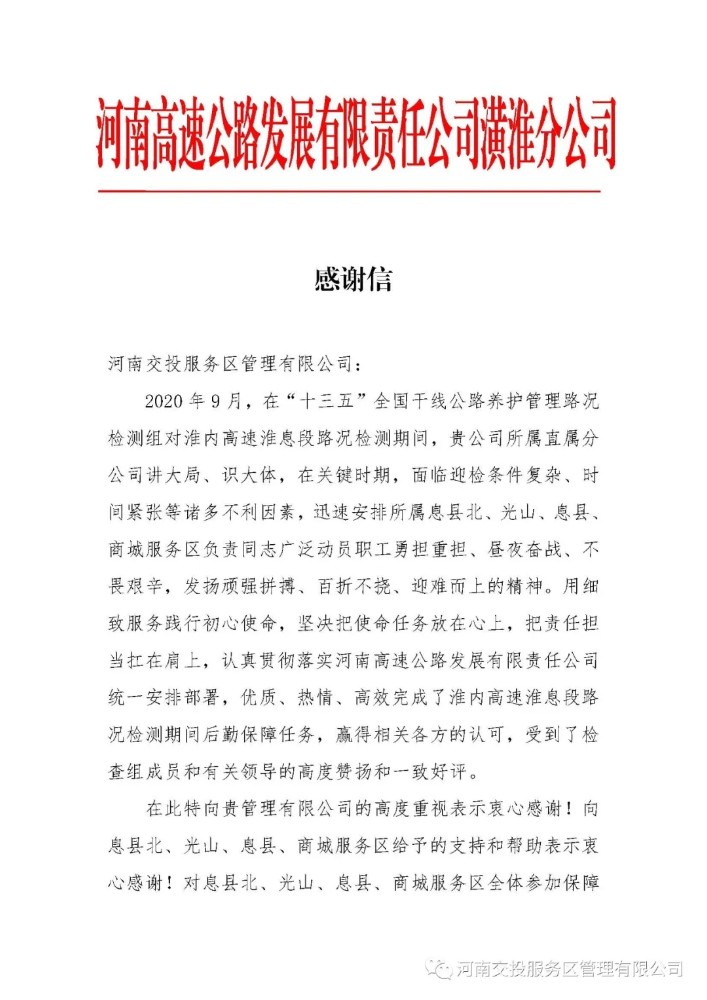 近日,高發(fā)公司潢淮分公司給公司發(fā)來《感謝信》,感謝公司所屬直屬分公司在2020 年 9 月“十三五”全國干線公路養(yǎng)護管理路況檢測組對淮內(nèi)高速淮息段路況檢測期間,講大局、識大體,所屬息縣北、光山、息縣、商城服務(wù)區(qū)負責同志勇?lián)負円箠^戰(zhàn)、不畏艱辛,優(yōu)質(zhì)、熱情、高效完成了淮內(nèi)高速淮息段路況檢測期間后勤保障任務(wù),贏得相關(guān)各方的認可,受到了檢查組成員和有關(guān)領(lǐng)導(dǎo)的高度贊揚和一致好評。