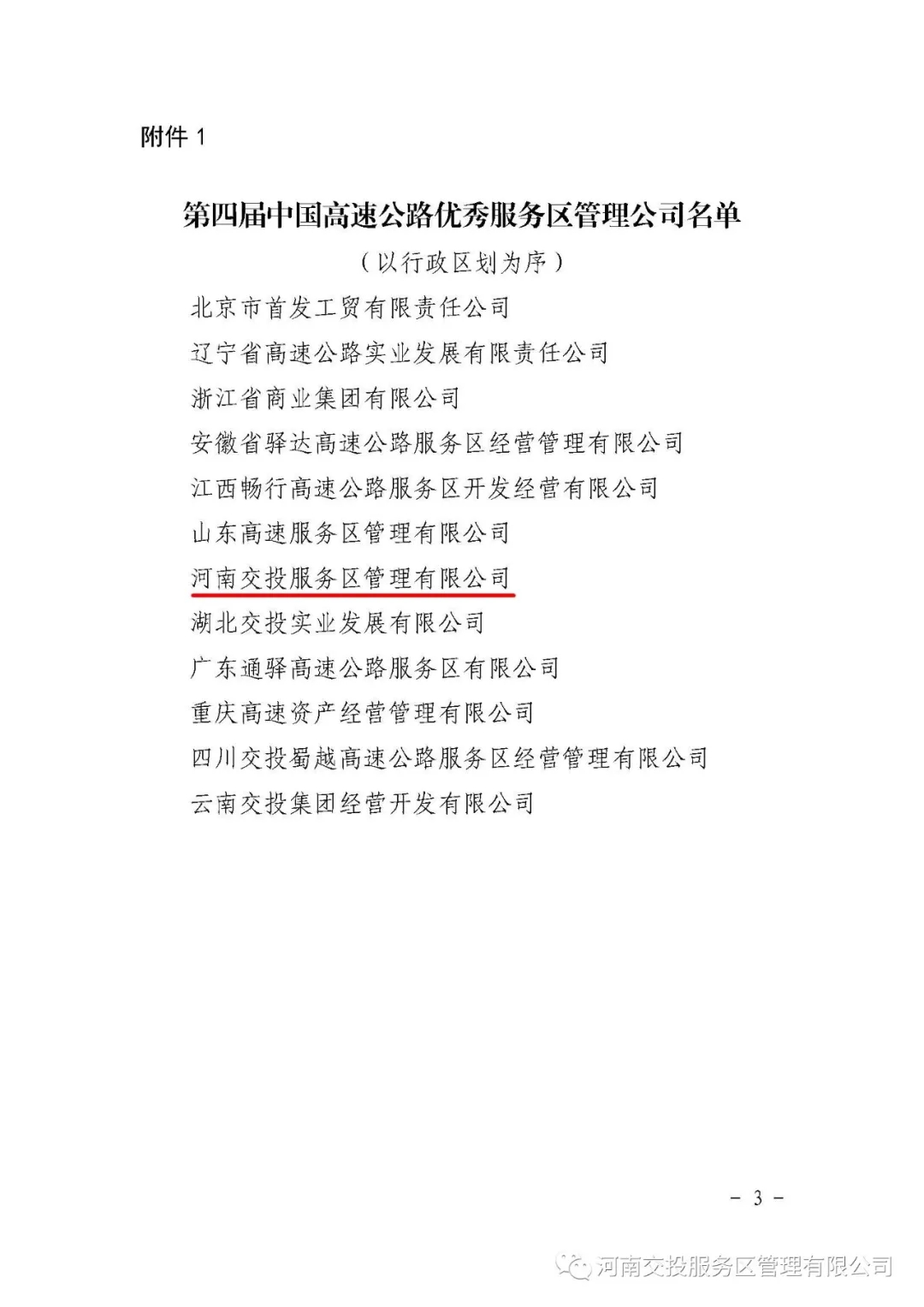 近日,由中國公路學會組織開展的第四屆“中國高速公路優秀服務區管理公司”和“中國高速公路服務區知名品牌”評選活動已圓滿結束,按照評選程序及標準,經形式審查,評審專家委員會集體評議,共評選出12 家“第四屆中國高速公路優秀服務區管理公司”,河南交投服務區管理有限公司名列其中,喜獲殊榮。下一步,公司將在集團的正確領導下,不忘初心、再接再厲,持續提升服務區的經營管理能力,切實為出行者提供品質服務,不斷促進高速公路服務區事業健康、持續發展。