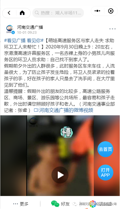 10月01日,大象網、微博視頻·河南交通廣播以題為《看見廣播 看見你——萌娃高速服務區與家人走失 求助環衛工人來幫忙!》對所屬許昌服務區好人好事進行了報道。