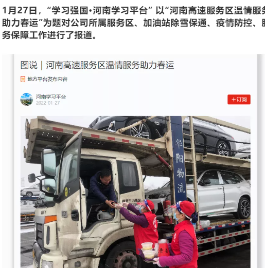 1月27日,“學習強國河南學習平臺” 以“河南高速服務區溫情服務助力春運”為題對公司所屬服務區、加油站除雪保通、疫情防控、服務保障工作進行了報道。