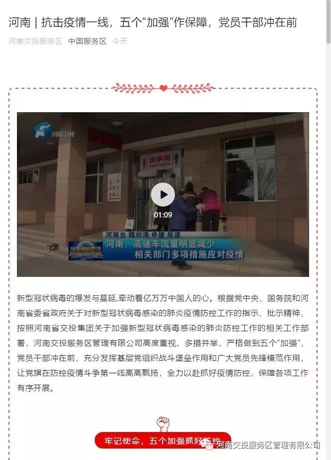 來源: 本站 發布時間: 2020-02-082月7日,中國服務區以題為《河南|抗擊疫情一線,五個“加強”作保障,黨員干部沖在前》對公司疫情防控工作進行了報道。