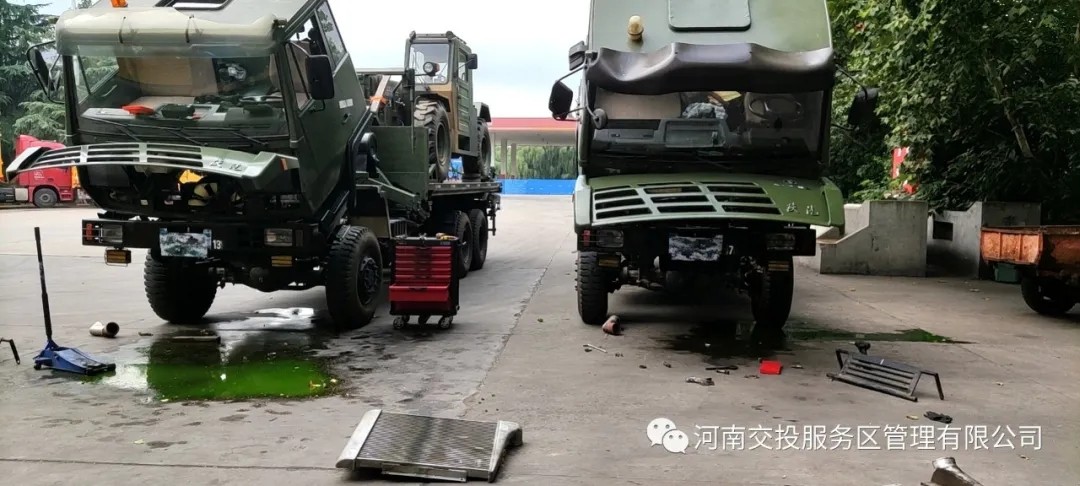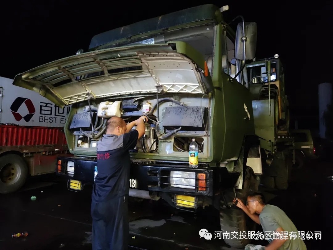 為盡快排除故障、消除隱患,許昌服務(wù)區(qū)迅速組織人員疏導(dǎo)交通,并立即聯(lián)系服務(wù)區(qū)汽修廠現(xiàn)場(chǎng)進(jìn)行緊急救援。經(jīng)排查發(fā)現(xiàn),故障是由于軍車途中遇到積水路面導(dǎo)致風(fēng)扇斷裂,水箱嚴(yán)重?fù)p壞所致。出于安全考慮,服務(wù)區(qū)立即將兩輛軍車拖到安全區(qū)域進(jìn)行搶修。時(shí)值酷暑季節(jié),汽修廠維修人員不顧高溫和疲乏,從當(dāng)晚20:00搶修至次日中午,順利幫助軍車排除了故障,確保了行軍計(jì)劃。
