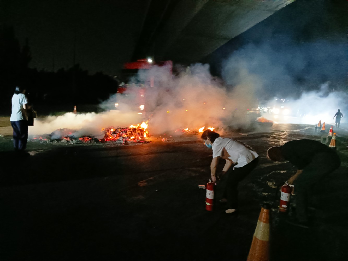 由于紙箱屬于易燃物,明火被撲滅后又因風力很快復燃,在連續噴射40多個滅火器后,工作人員打開消防栓,接上水龍帶進行撲救,有效控制了火勢的蔓延。隨后,消防車及時抵達現場,在服務區的配合下火勢得以被控制。為防止復燃和其他次生災害發生,工作人員持續開展澆水冷卻等后續工作。此次事故是由于輪胎高溫引燃所載紙箱引發火災,駕駛員激動地說:“幸虧正好經過服務區,再晚一點車就完了,60多萬呢!謝謝你們!”此次突發事件的成功處置,得益于服務區常態化開展應急消防演練,關鍵時刻人人都是“消防戰士”,能夠有條不紊、安全高效地處置火情,為公眾安全出行保駕護航。