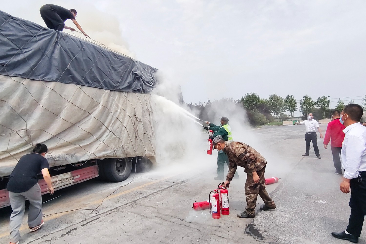5月10日13:40左右,一輛滿載貨物的車輛冒著滾滾濃煙駛?cè)氚碴?yáng)服務(wù)區(qū),工作人員發(fā)現(xiàn)后立即將車輛引導(dǎo)至降溫加水處,同時(shí)啟動(dòng)消防應(yīng)急預(yù)案,一邊設(shè)立警戒隔離、維護(hù)現(xiàn)場(chǎng)秩序、疏散過(guò)往車輛人員,一邊用滅火器控制火勢(shì),用水管對(duì)冒煙部位進(jìn)行降溫滅火,及時(shí)有效控制火勢(shì)蔓延。20分鐘后,消防車趕到,最終在大家的共同努力下,火情被成功撲滅。