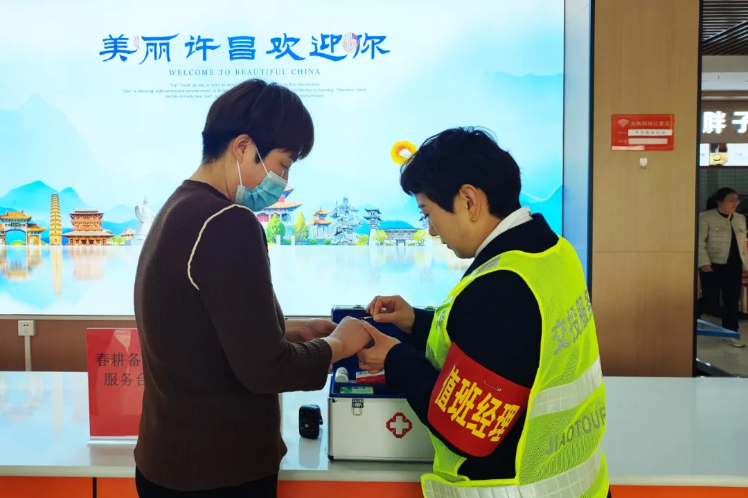 4月4日,許昌服務區工作人員幫助手部受傷顧客包扎傷口