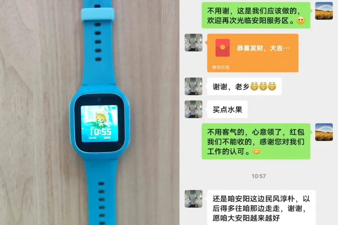4月5日,安陽服務區工作人員撿到一部電話手表,失主欲發紅包表示感謝被婉言謝絕